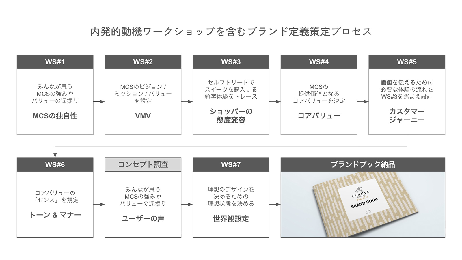こうした課題を踏まえ、まずブランドの再定義から着手しました。FICCは実装を視野に入れ、ゴディバのプロジェクトメンバーと全7回のワークショップを実施。組織内で共有できる共通言語と判断軸を整えていきました。