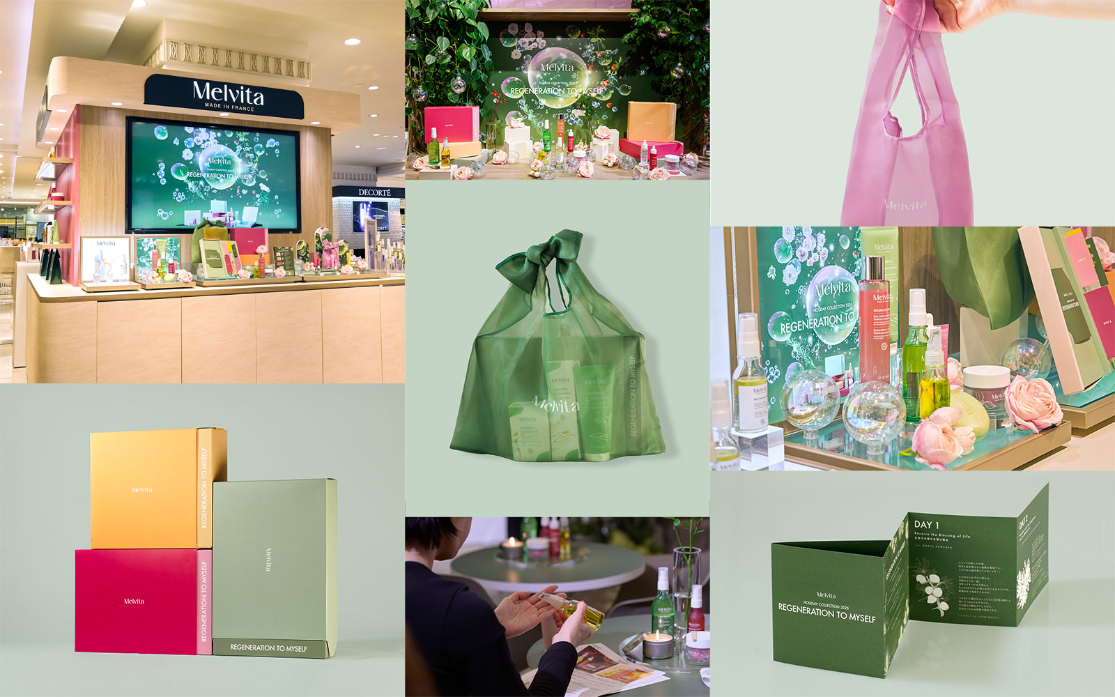 プロモーション戦略の設計に加え、Melvita HOLIDAY 2025におけるキービジュアル、特設サイト、オリジナルアドベントカレンダーやギフトボックス、コンセプト冊子の制作、トークセッションイベントの企画、店頭VMDの設計まで、幅広いクリエイティブ開発を行いました。「REGENERATION TO MYSELF 〜自分の自然体(リズム)を取り戻す特別なホリデー〜」というコンセプトを軸に、さまざまなタッチポイントでブランドのベネフィットを体感できる設計としています。