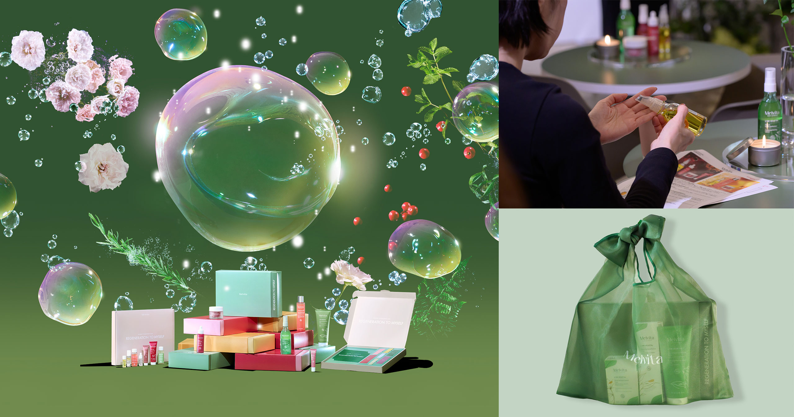 プロモーション戦略の設計に加え、Melvita HOLIDAY 2025におけるキービジュアル、特設サイト、オリジナルアドベントカレンダーやギフトボックス、コンセプト冊子の制作、トークセッションイベントの企画、店頭VMDの設計まで、幅広いクリエイティブ開発を行いました。「REGENERATION TO MYSELF 〜自分の自然体(リズム)を取り戻す特別なホリデー〜」というコンセプトを軸に、さまざまなタッチポイントでブランドのベネフィットを体感できる設計としています。