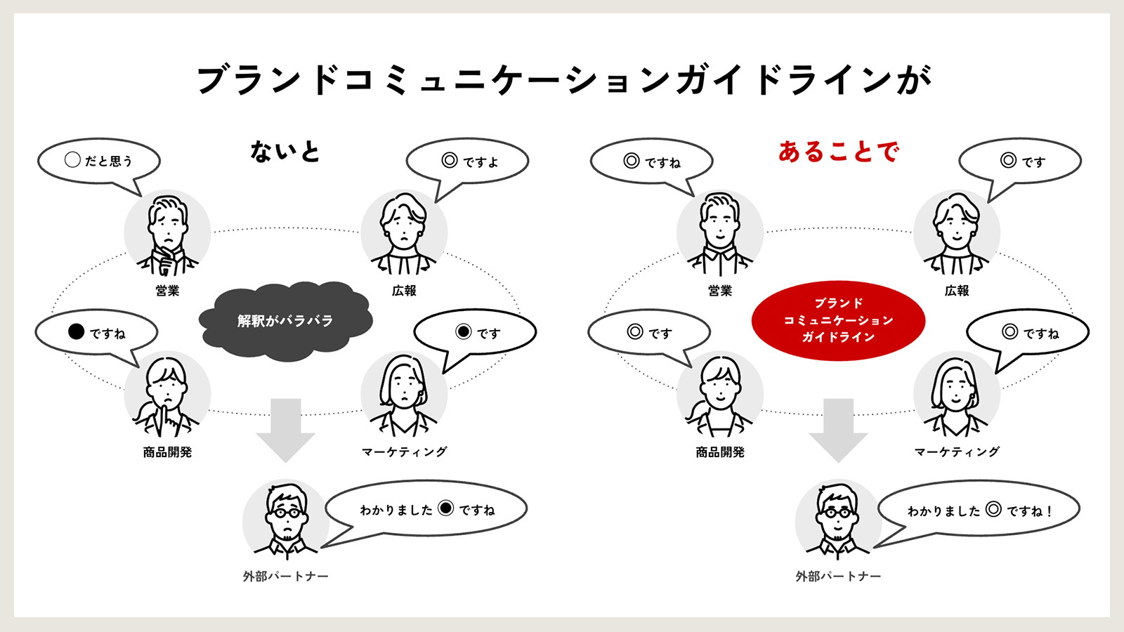 一方で、経営層が掲げるビジョンや方針が、現場での業務にまで接続され切れていないケースは多く存在しています。「ブランドコミュニケーションガイドライン」は、こうした課題を解消し、ブランド戦略と体験目標を可視化・共有することで、全社的なブランドマネジメントを実現するメソッドとして機能しています。