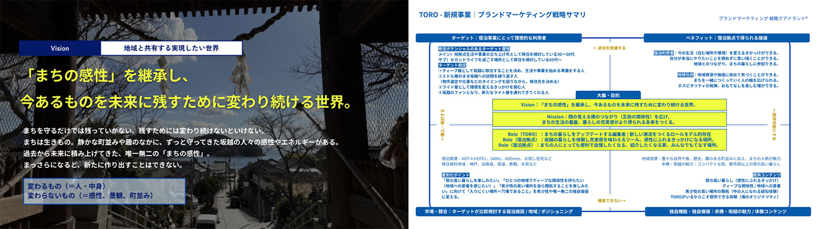 さらに、市場・外部環境のリサーチを踏まえた事業戦略方針と、ビジョンを起点とするブランドマーケティング戦略の両面から方向性を整理。TOROによる新たな事業が生まれることで、坂越のまちがどのように変わっていくのか。地域の関わる人たちが共感し、共に未来を描けるよう、その絵図を「ビジョンマップ」として可視化しました。