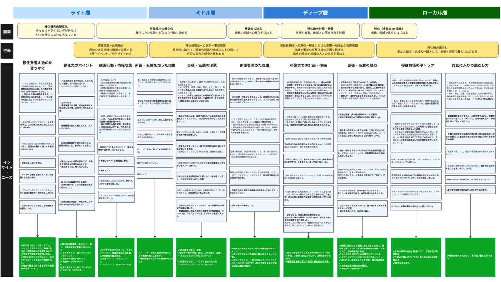その検討にあたり実施したのが、移住成功者アンケートです。実際に坂越へ移住した方々に、惹かれた理由や移住を決めた背景をヒアリングし、その価値観や移住に至るプロセスを整理。「移住成功者ジャーニー分析」として可視化しました。