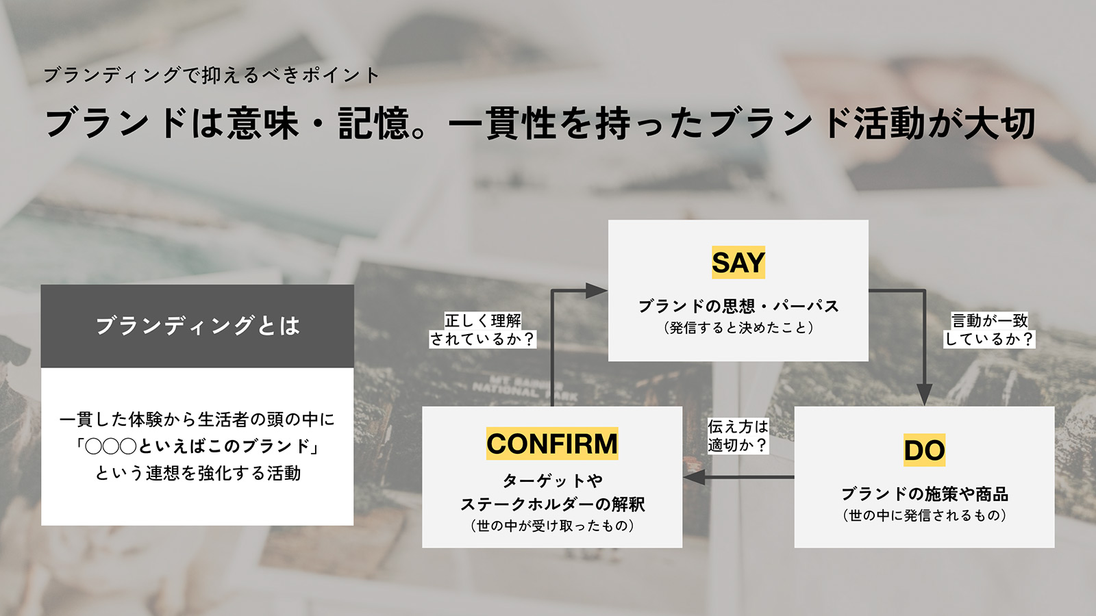 まず、ブランディングとは、生活者の中にあるブランドの「意味・記憶」を蓄積していく活動だと伝え、ブランドの活動を「Say-Do-Confirm」というフレームで捉えて解説していきました。