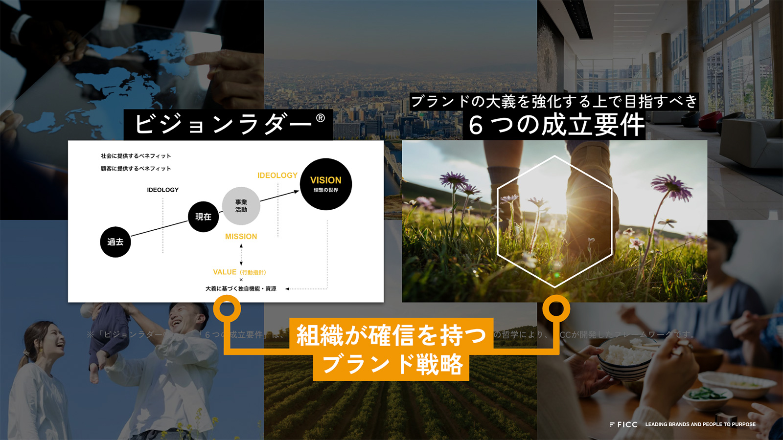 そのためFICCでは、「ビジョンラダー®」に加え、内発的動機に向き合うワークショップやブランドの組織浸透と動機形成、ブランドコミュニケーションガイドライン、ブランド体験設計、クリエイティブまで一貫した支援を行っています。戦略が物語として共有され、体験として積み重なっていくことで、ブランドは組織の内側から外へと広がっていきます。
