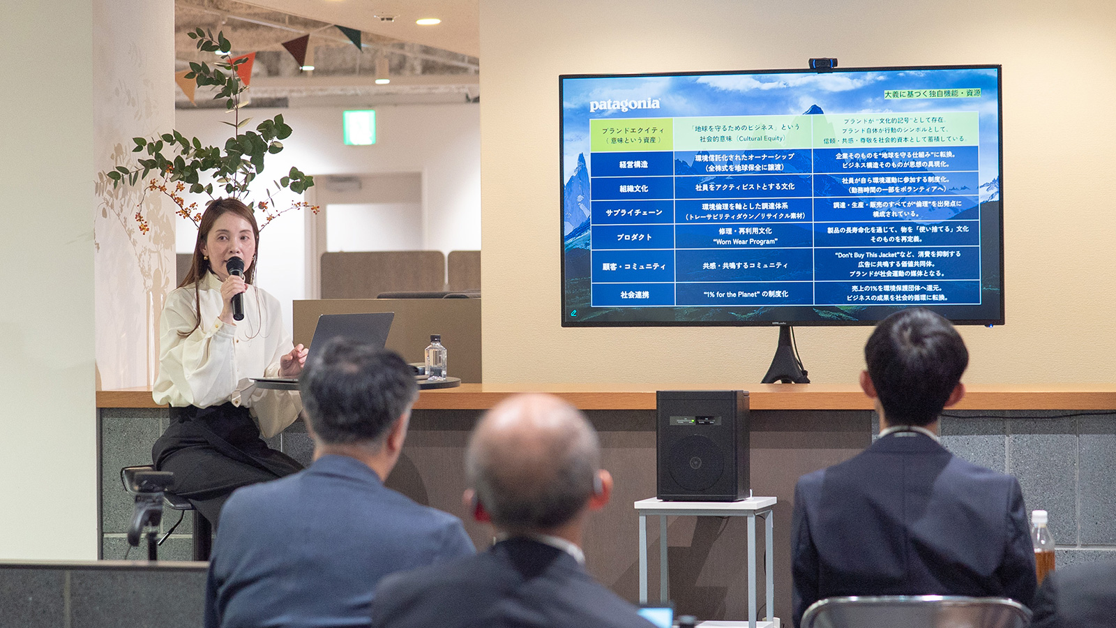 その構造を体現する例として紹介されたのが、パタゴニアです。パタゴニアは「ビジネスそのものが自然環境を守る仕組みとして機能する社会」をビジョンに掲げ、「故郷である地球を救うためにビジネスを営む」というミッションを明確にしています。
