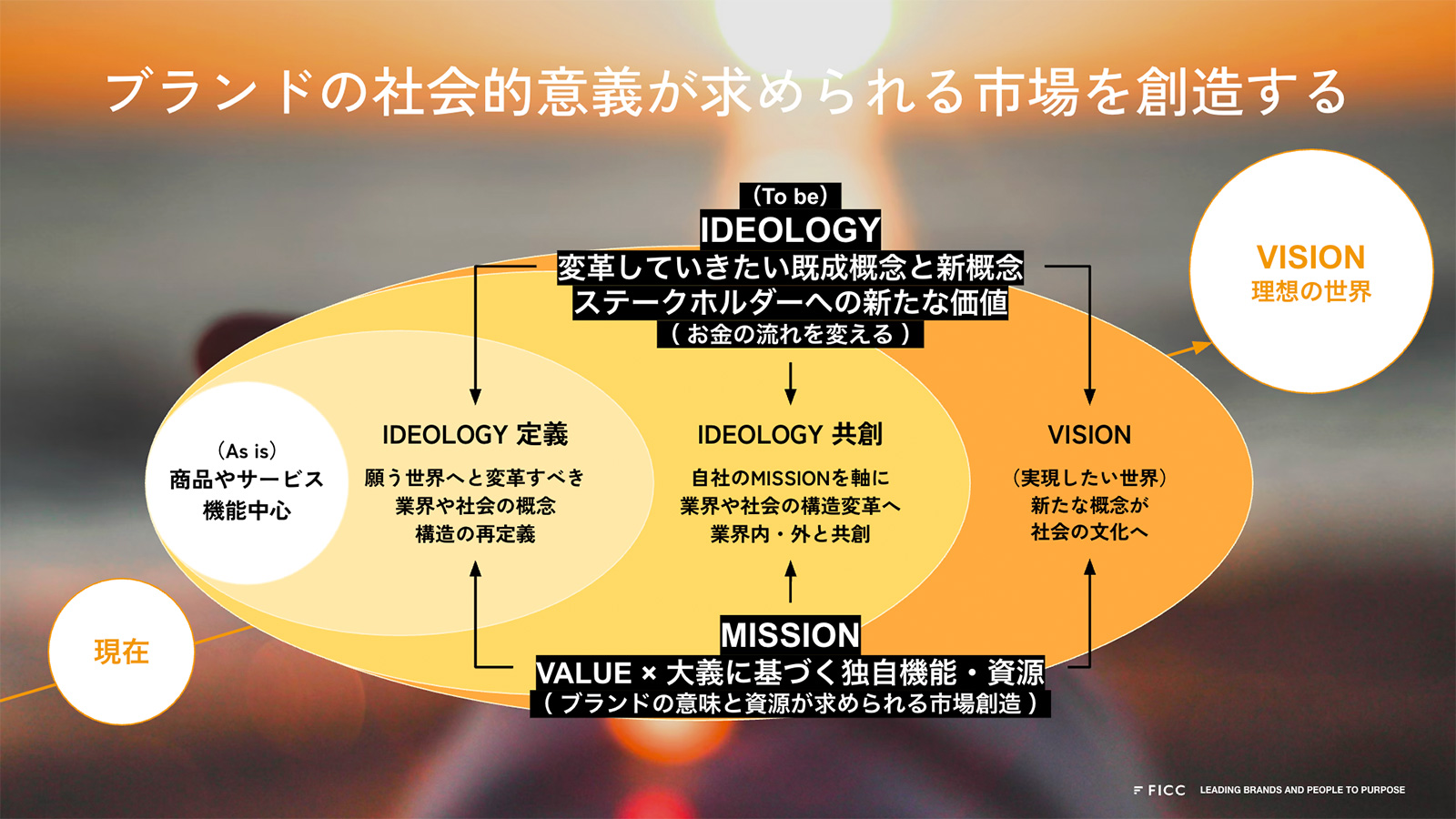 パタゴニアの事例でもわかるように、ブランド戦略を「機能や性能を中心に語る状態(As is)」から、「そもそも何を変革したかったのか」を起点に再定義していくことが重要です。一社では達成できないビジョンに向かって、誰と、どのように共創していくのか。最終的にはビジョンが社会の文化となっていく。イデオロギーを、As isに対するTo beとして掲げることで、お金の流れや意思決定の基準が変わり、社員を含むステークホルダーに新しい選択肢や価値を提示していく。その過程で、自分たちの行動指針と大義に基づく独自資源や機能によってミッションを実行し、ブランドの意味と資源が求められる市場をいかにしてつくっていくのか。これが、ブランドマーケティングが本来持つ力です。