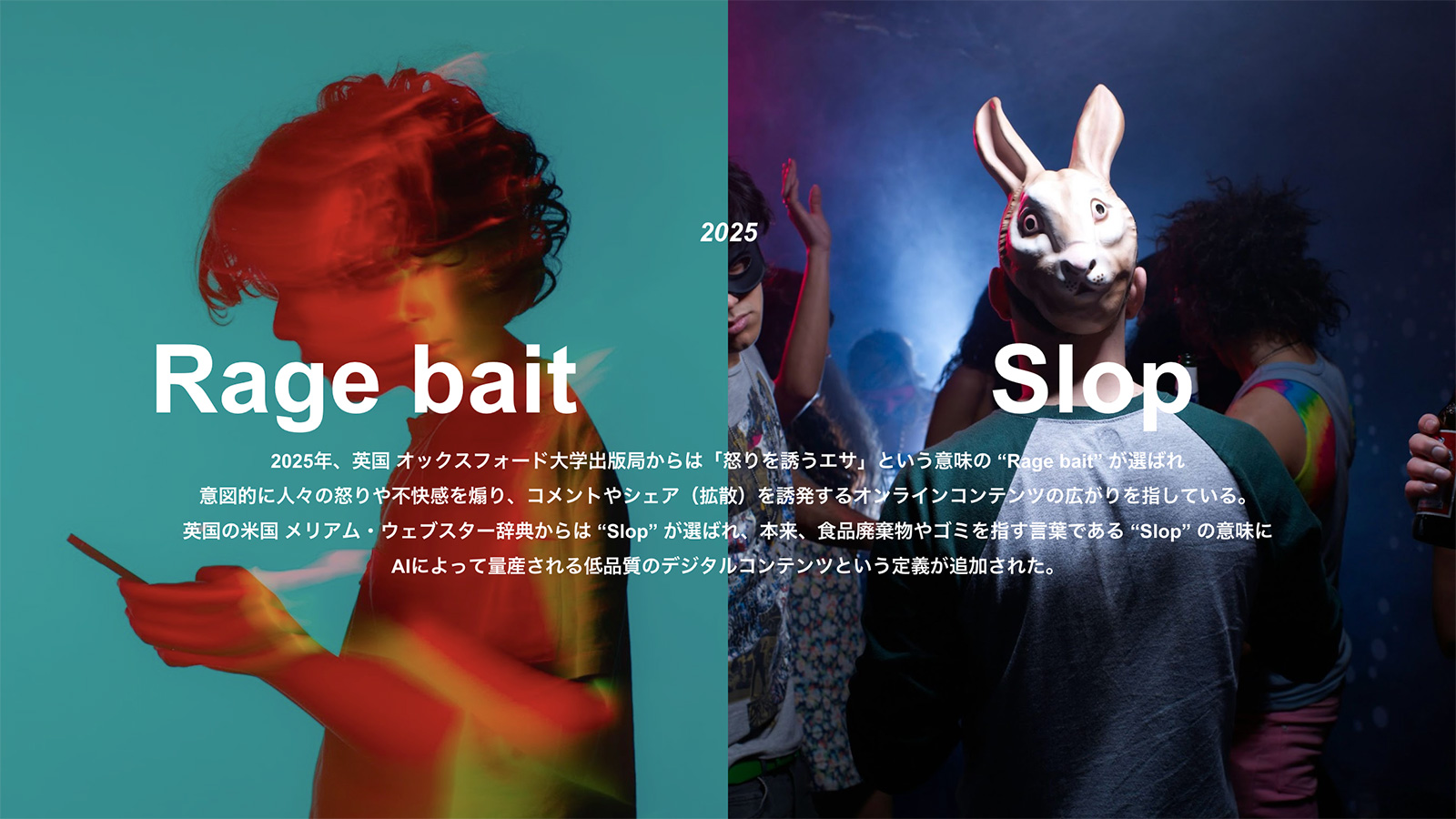こうした流れの中で迎えた2025年。この年を象徴する言葉として挙げられたのが、 “Vibe coding”、“Parasocial”、“Rage bait”、“AI slop” といった言葉でした。自然言語でAIに指示を出し、感覚的に開発が進んでいく “Vibe coding”。有名人やインフルエンサー、AIに対して一方的なつながりを感じる一方で、実際には距離がある関係性を示す “Parasocial”。SNS上で怒りや不快感を煽り、拡散を目的とする “Rage bait”。そして、生成AIによって量産される、意味を伴わない低品質なコンテンツを指す “AI slop”。