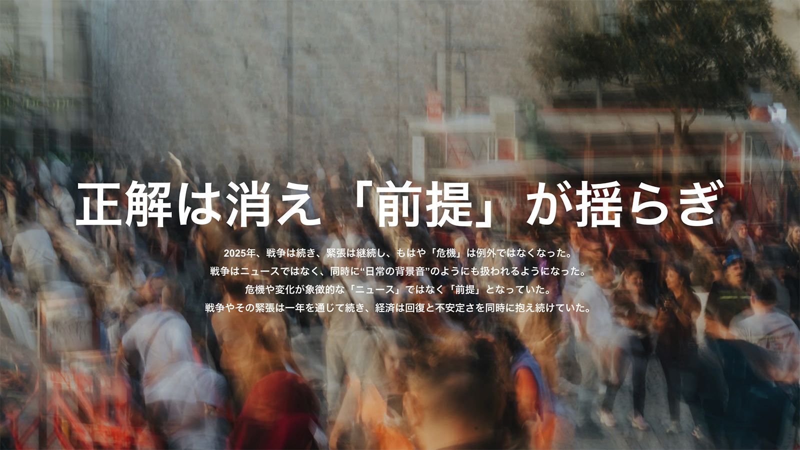 さらにこの年を特徴づけていたのは、危機や変化がもはや象徴的な「ニュース」ではなく、「前提」として私たちの日常に組み込まれていたことです。戦争や地政学的緊張、経済の不安定さは、一過性の出来事ではなく、常に背景として存在し続けていました。