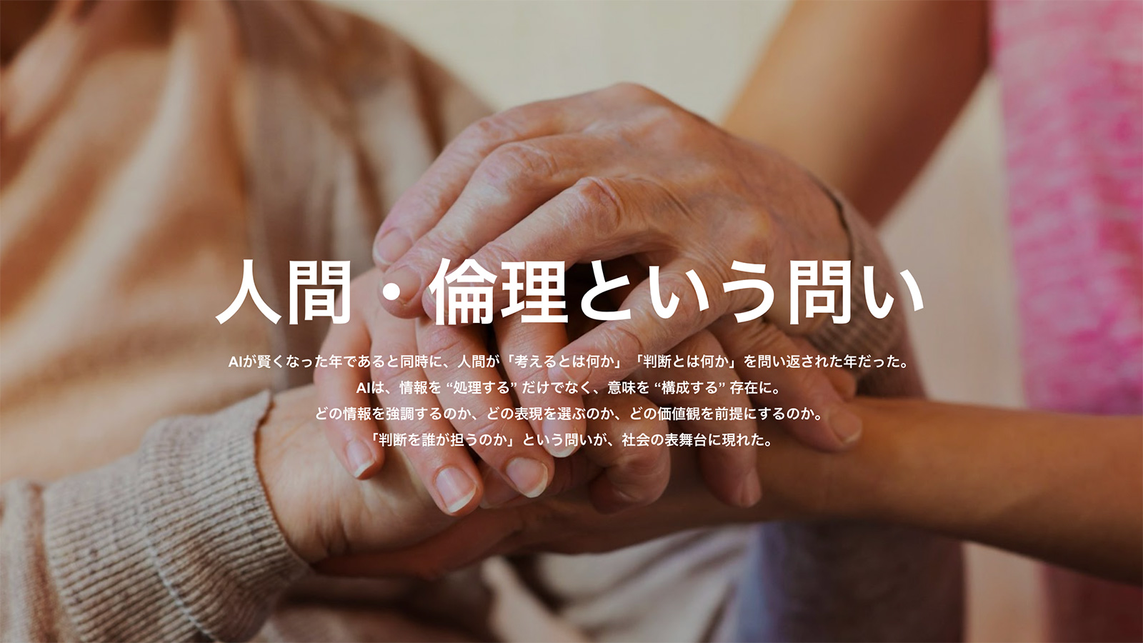 生成AIは、私たちの代わりに文章を書き、画像を描き、要約し、判断を下す存在へと急速に広がっていきました。その振る舞いは驚くほど流暢で正確であり、時に人間以上に “それらしく”見える場面も増えていきました。しかし、AIは情報を処理することはできても、何を重視し、何を切り捨てるのかという価値判断そのものを引き受ける存在ではありません。どの情報を強調するのか、どの表現を選ぶのか、どの価値観を前提にするのか。そうした判断は、最終的には人間に委ねられています。2025年は、AIが賢くなった年であると同時に、人間が「考えるとは何か」「判断とは何か」を問い返された年でした。