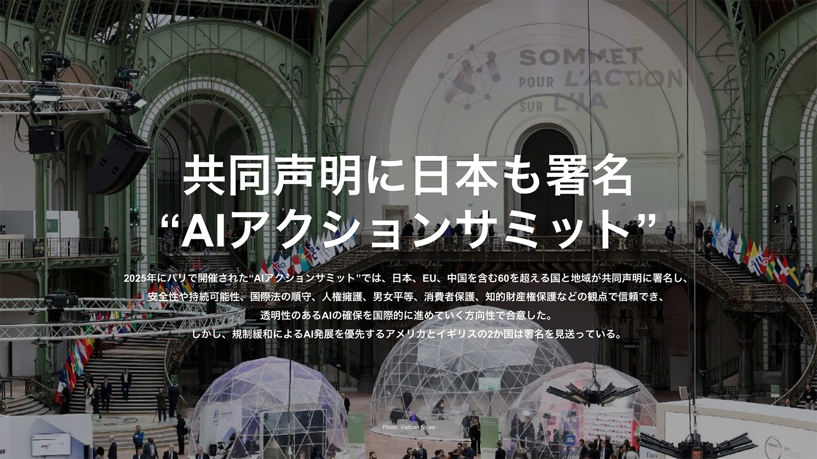 2025年に開催されたAIアクションサミットでは、日本やEU、中国を含む60を超える国と地域が共同声明に署名し、信頼できるAIを国際的に進めていく方向性が示されました。一方で、規制緩和による発展を優先するアメリカとイギリスは署名を見送っています。ここに表れているのは、制度の違いというよりも、「何を守ろうとしているのか」という価値観の差です。