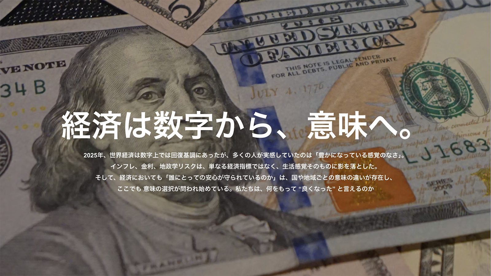 2025年、世界経済は数字の上では回復基調にあると語られていましたが、多くの人が日々の生活の中で感じていたのは、「豊かになっている実感のなさ」でした。インフレや金利、為替、地政学リスクは、もはや単なる経済指標ではなく、住宅ローンや雇用、物価、将来への不安といった形で、生活感覚そのものに影を落としていました。そして経済においても、「誰にとっての安心が守られているのか」は、国や地域ごとに意味の違いが存在し、意味の選択が問われ始めています。私たちは、何をもって “良くなった” と言えるのか。