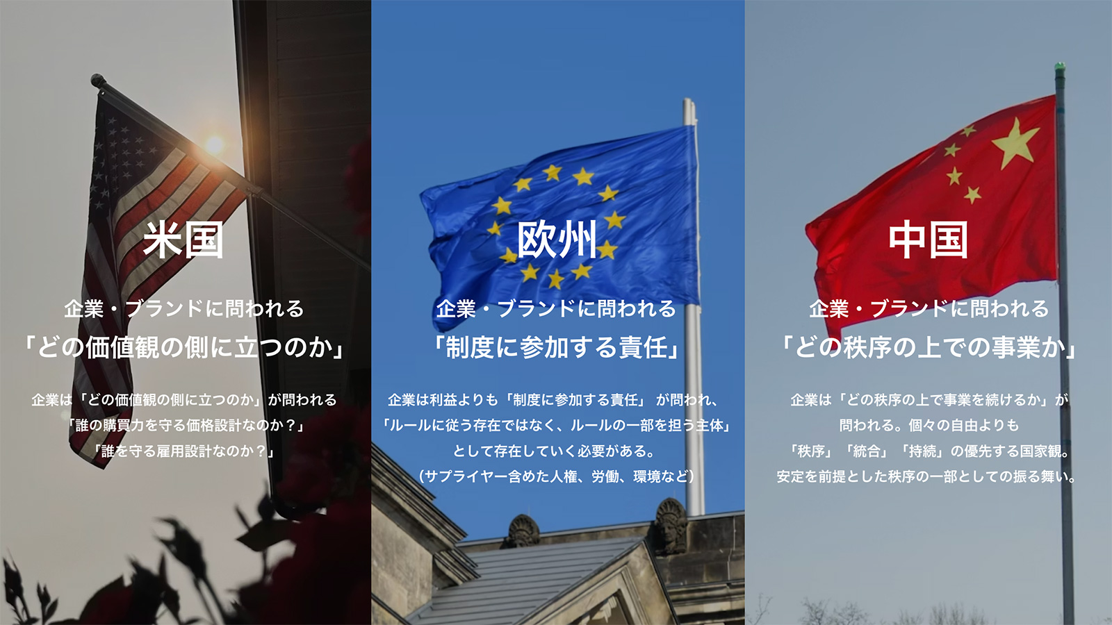 こうして見ると、各国の判断の背後には、それぞれ異なる「安心」の定義があることが分かります。そしてその選択は、企業やブランドにも確実に返ってきています。価格は誰の購買力を守るためのものなのか。雇用は誰を守るための設計なのか。サプライヤーを含めた人権や労働、環境を、どこまで責任を引き受けるのか。ブランドとして、どの秩序の上で事業を続けていくのか。経済の問いは、そのまま企業やブランドの価値観の問いへと接続していきます。