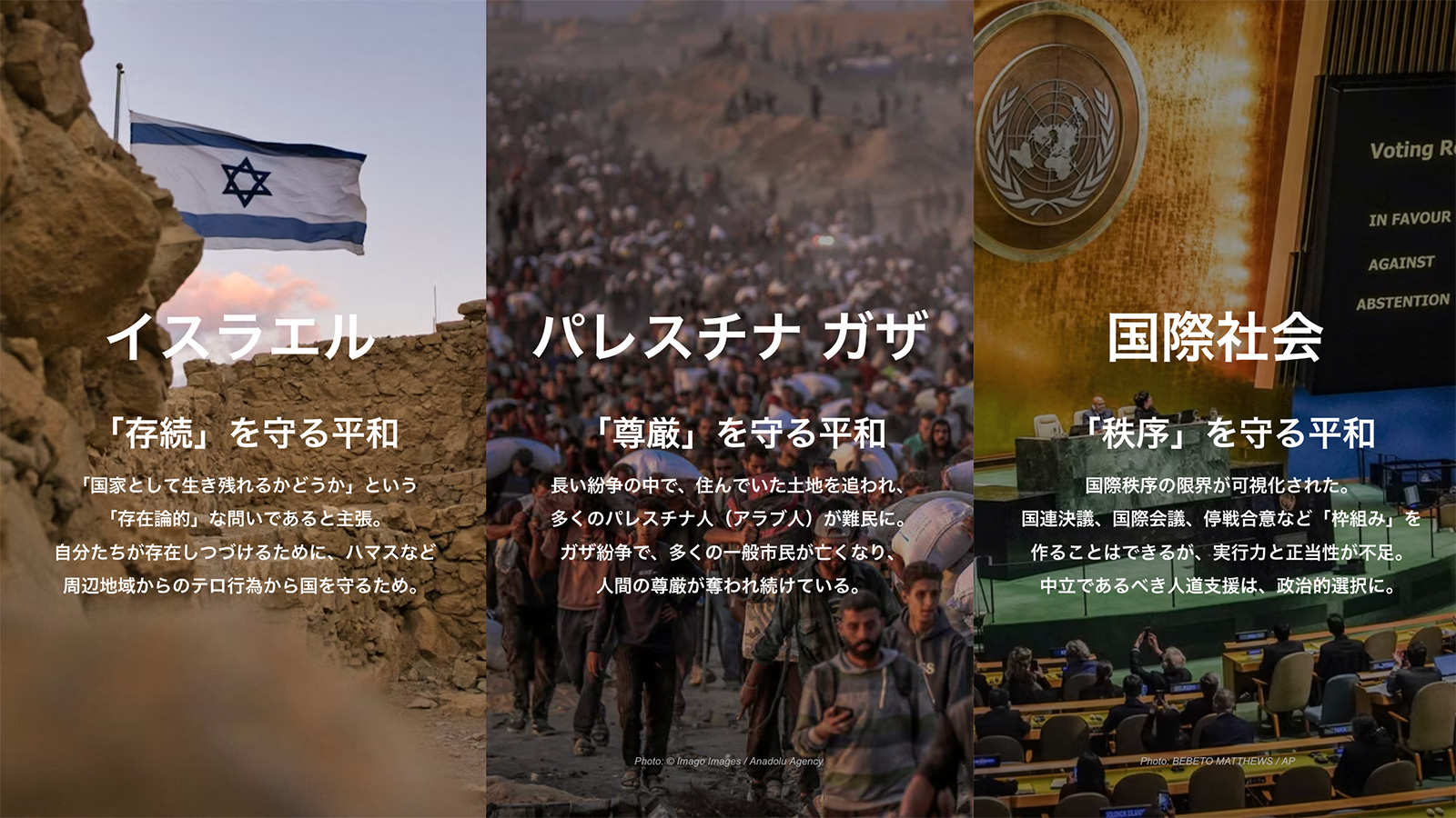 一方、パレスチナ自治区ガザにとっての平和は、「尊厳」を守ることです。長い紛争の中で土地を追われ、多くのパレスチナ人が難民となってきました。ガザ紛争では多くの一般市民が命を落とし、日常生活そのものが奪われ続けています。ここで語られる平和は、生き延びること、人間としての尊厳を保つことと深く結びついています。