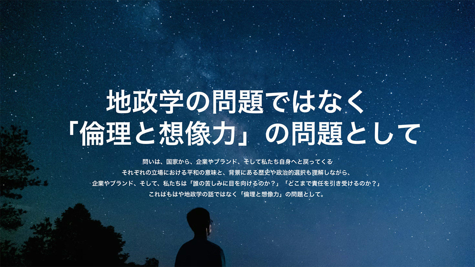 ここで問われているのは、それぞれの立場における平和の意味と、その背後にある歴史や政治的選択を理解しながら、企業やブランド、そして私たち自身が、「誰の苦しみに目を向けるのか」「どこまで責任を引き受けるのか」を考え続けることです。これはもはや国家間の力学や地政学の問題ではなく、「倫理と想像力」の問題です。