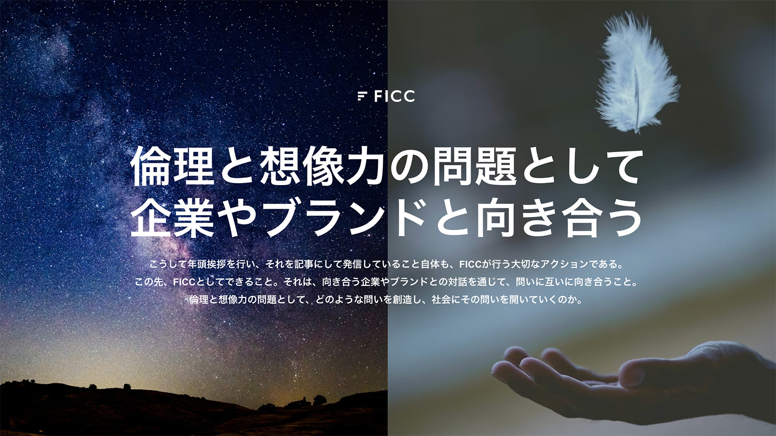 こうして年始挨拶を行い、それを発信すること自体も、FICCが大切にしているアクションの一つです。向き合う企業やブランドとともに、問いに向き合い、対話を重ねながら、その問いを社会にひらいていくこと。倫理と想像力の問題として、どのような問いを立て、どのように共有していくのか。
