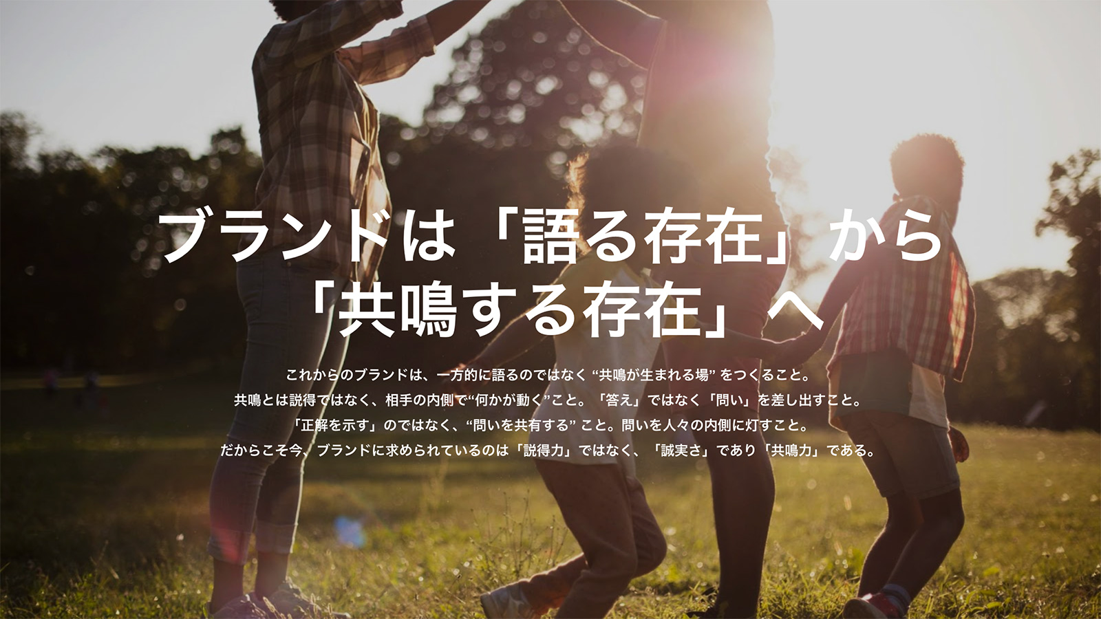 いま、ブランドは「語る存在」から「共鳴する存在」へと変わりつつあります。一方的に語るのではなく、共鳴が生まれる場をつくること。共鳴とは説得ではなく、相手の内側で何かが動くことです。「答え」を示すのではなく、「問い」を差し出すこと。「正解を示す」のではなく、問いを共有すること。問いを人々の内側に灯すこと。ブランドに求められているのは、強い主張ではなく、「誠実さ」や「共鳴力」です。