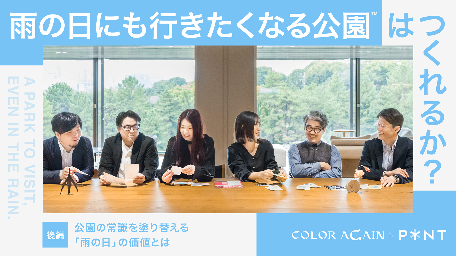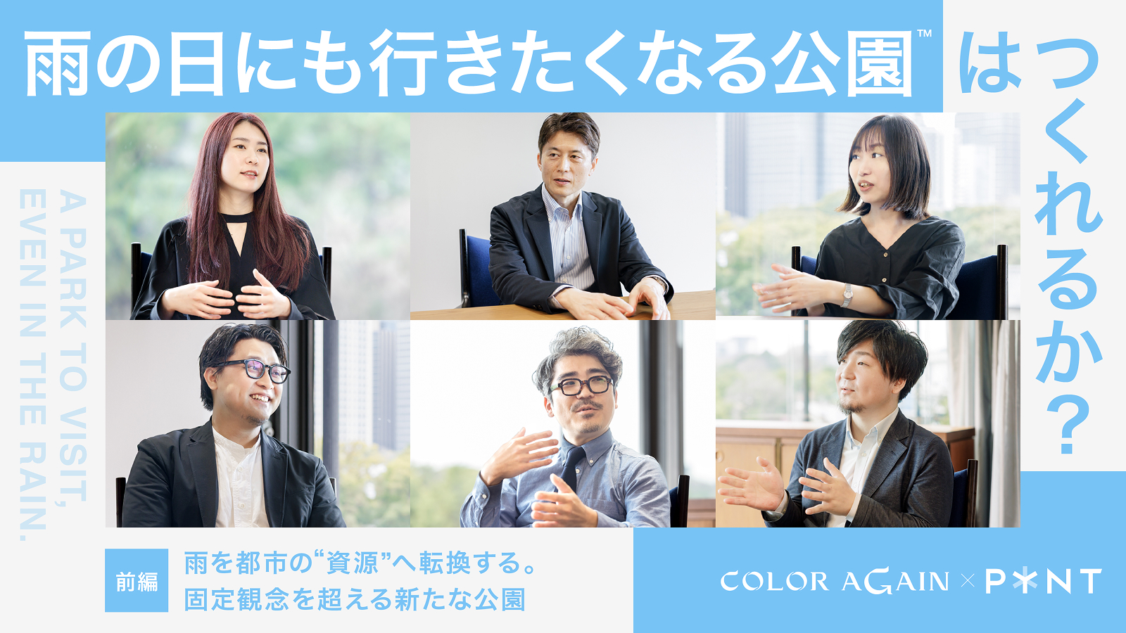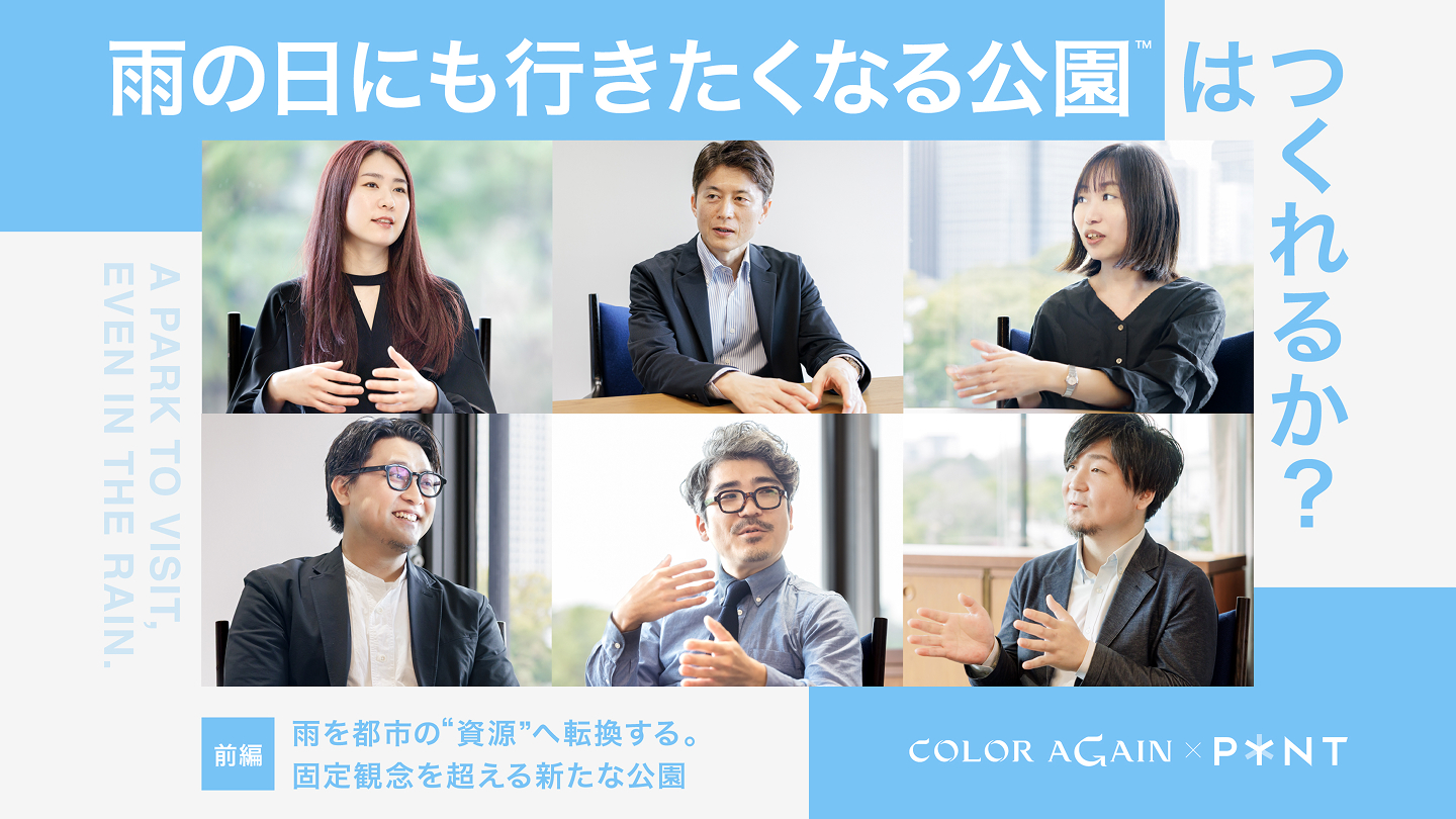 いま、ネガティブに捉えられる「雨」に正面から挑む斬新なアイデアが動き出しています。『雨の日にも行きたくなる公園™︎』です。それを手掛けるのは、企業や自治体のブランドマーケティングを支援するFICCと、廃棄される化粧品から独自の技術で新たな価値を創出するモーンガータ。今回、都市から建築まで幅広く手掛ける日建設計が専門家として参画し、本構想の実現に向けて全面協力しました。なぜ彼らがタッグを組んだのでしょうか。日建設計が運営する共創プラットフォーム「PYNT(ピント)」で語ったその経緯を前編・後編に分けてお送りします。